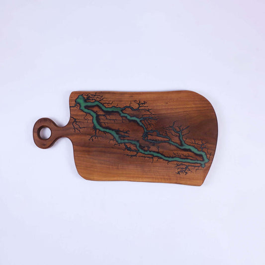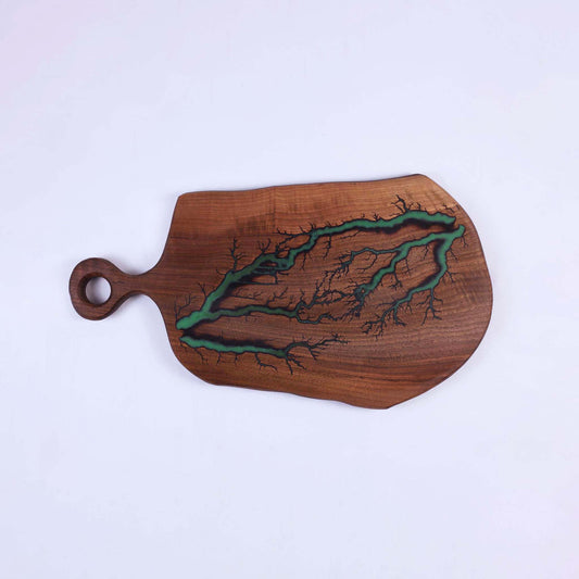 Нашите дъски са изработени от цяло парче орехово дърво – без слепени парчета, за да запазим естествената здравина и красота на материала. Всяка дъска преминава през специален процес на Lichtenberg изгаряне, който създава уникални фигури върху дървото, допълнени с епоксидна смола. Този метод гарантира, че няма две еднакви дъски – всяка е индивидуално произведение на изкуството, ръчно изработено с внимание към всеки детайл от нашите майстори.
