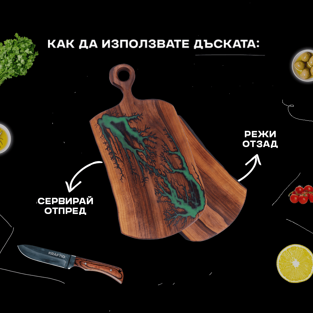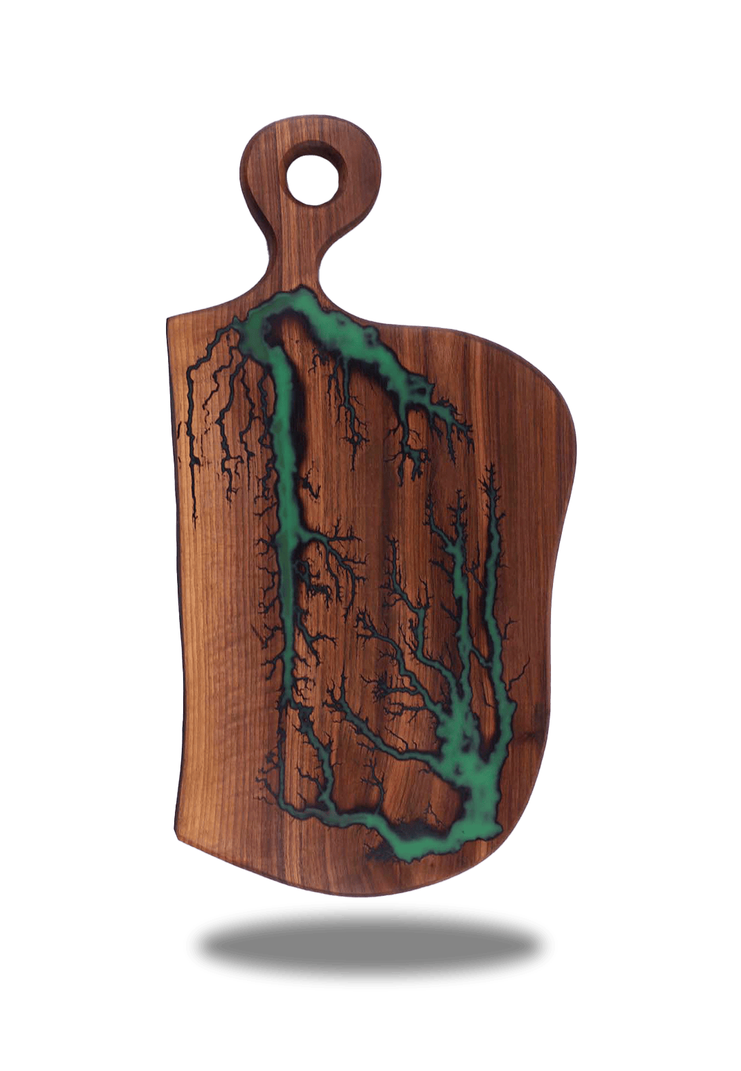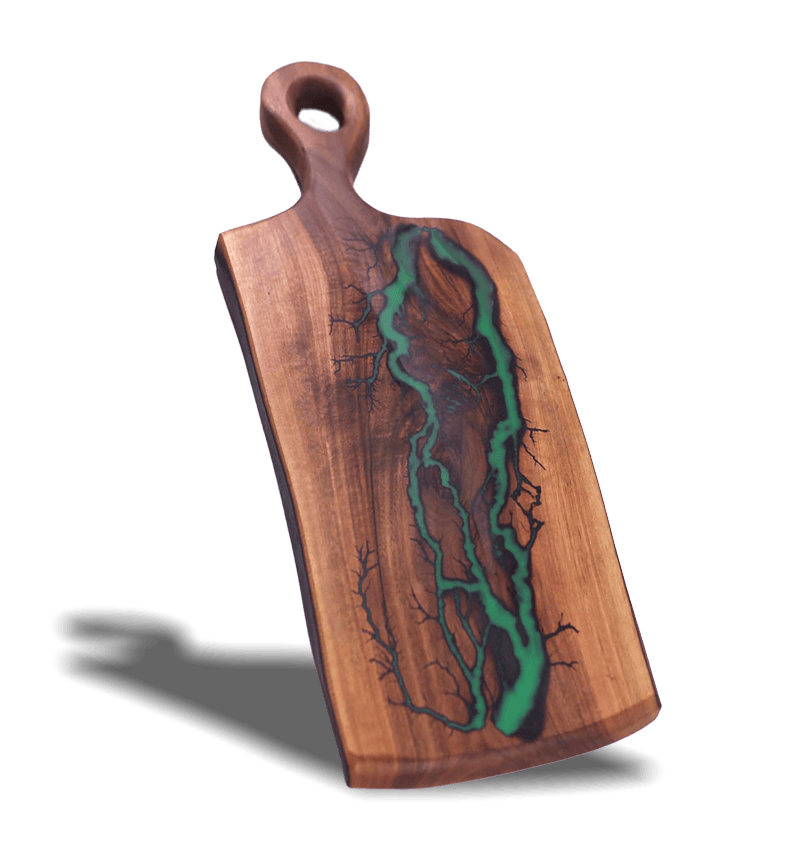 Нашите дъски са изработени от цяло парче орехово дърво – без слепени парчета, за да запазим естествената здравина и красота на материала. Всяка дъска преминава през специален процес на Lichtenberg изгаряне, който създава уникални фигури върху дървото, допълнени с епоксидна смола. Този метод гарантира, че няма две еднакви дъски – всяка е индивидуално произведение на изкуството, ръчно изработено с внимание към всеки детайл от нашите майстори.