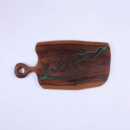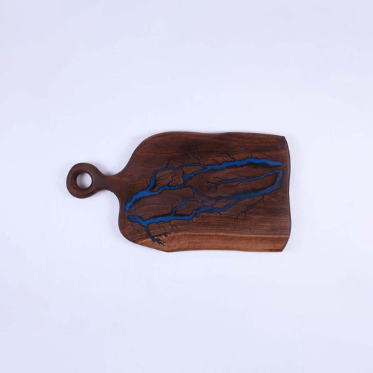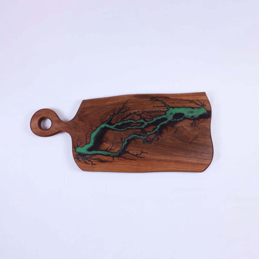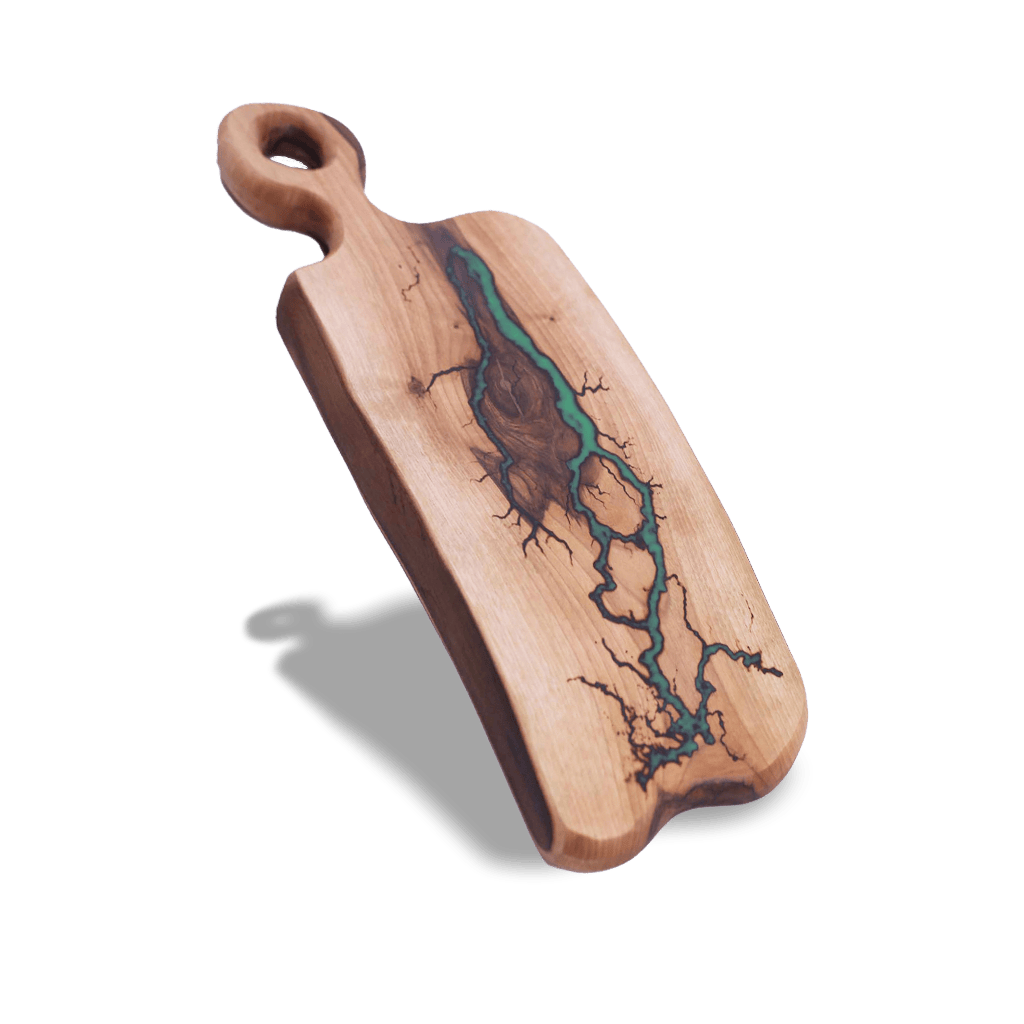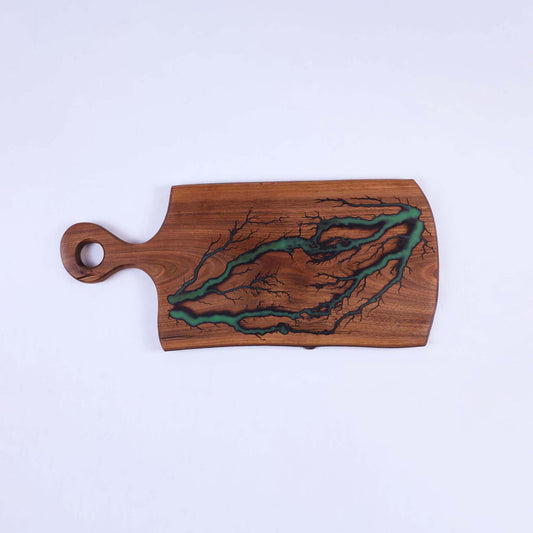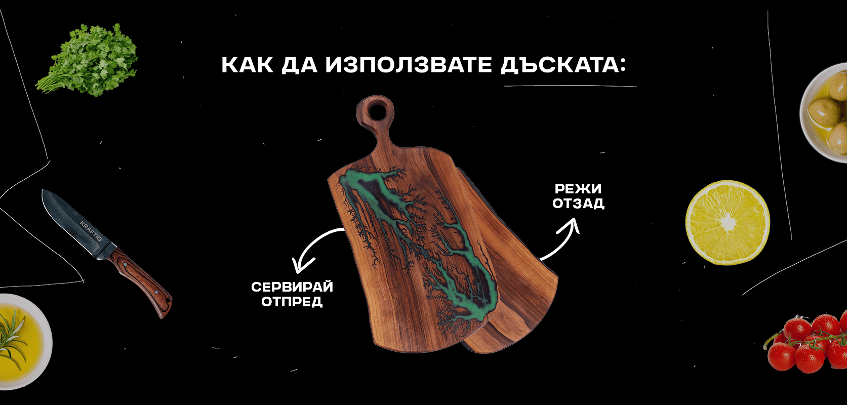 Нашите дъски са изработени от цяло парче орехово дърво – без слепени парчета, за да запазим естествената здравина и красота на материала. Всяка дъска преминава през специален процес на Lichtenberg изгаряне, който създава уникални фигури върху дървото, допълнени с епоксидна смола. Този метод гарантира, че няма две еднакви дъски – всяка е индивидуално произведение на изкуството, ръчно изработено с внимание към всеки детайл от нашите майстори.